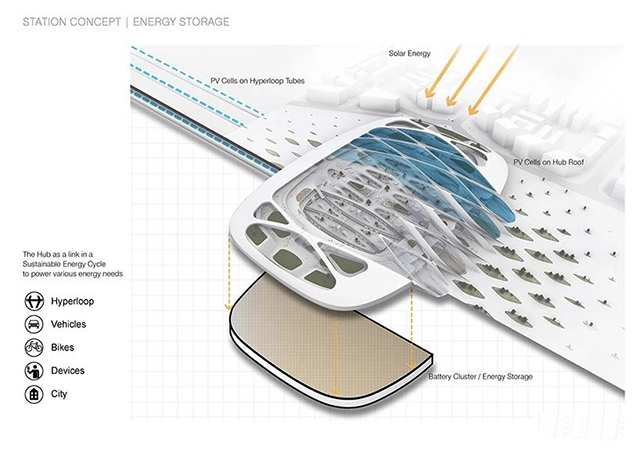 the architects believe that hyperloop stations could function as batteries for solar energy, potentially bringing about a shift away from dependency on centralized power plants and towards energy storage that connects to local micro-grids. ‘in the very near future, buildings will function as batteries, providing energy not only for their own immediate needs, but also for surrounding public amenities and transportation modes,’ ben van berkel explains.