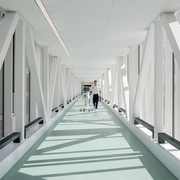 修建基于一个简朴而有用的设计原理:一系列折叠的V型结构,这些结构通过横向毗连捆绑在一起。这种奇异的形状为患者创立了五个休闲中庭以及大型医院的定位点。