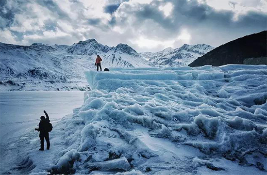 而冰川的未端与冰湖之间