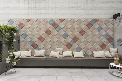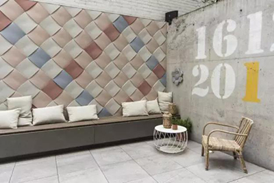 如上图,这是某公司设计的“编织”混凝土瓷砖,他们的灵感泉源于沙丘和古板的编织工艺,将它们大面积贴于墙面时,形成了很是有趣的质感反差——极像一面由布料编织出来的墙体,很难想象它是由坚硬的混凝土创立而来。